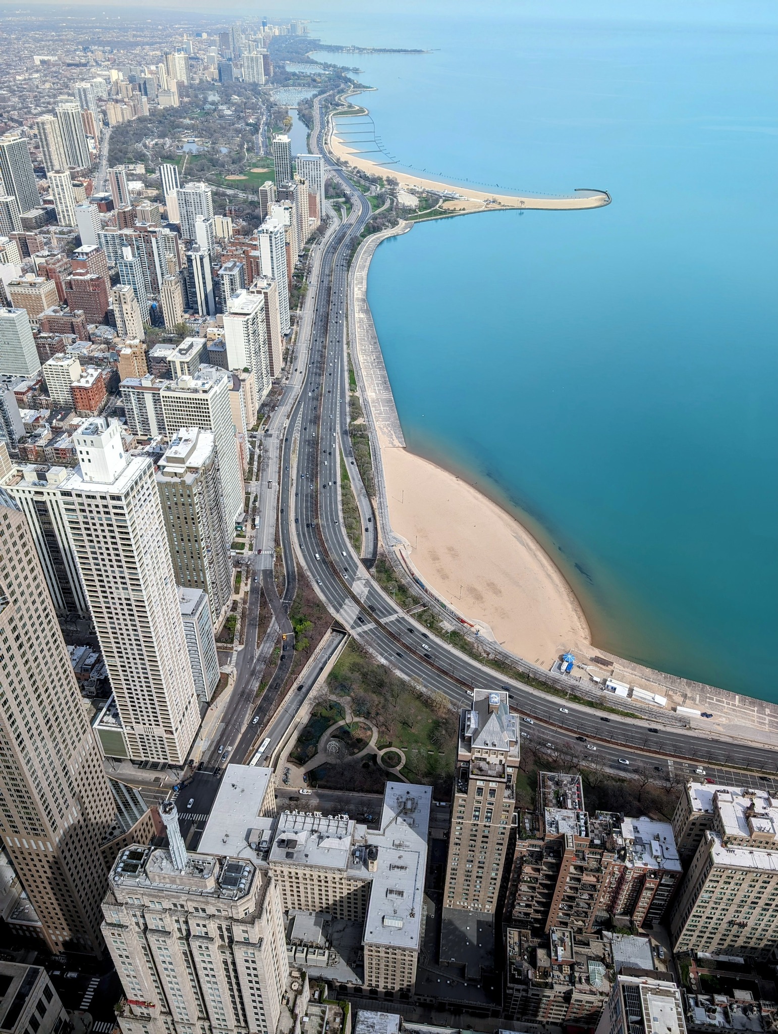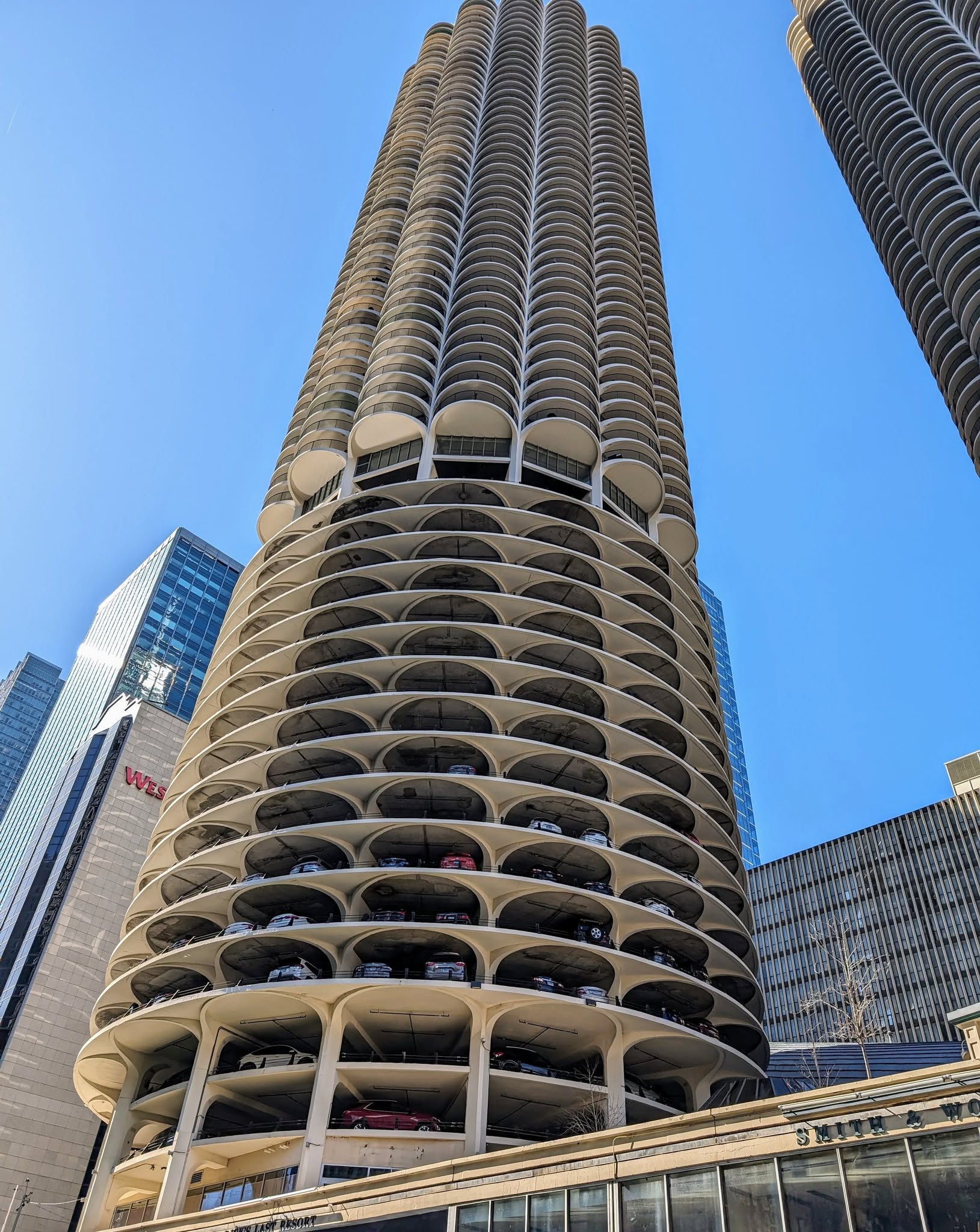 The curvy building is the tallest building designed by a female architect. It has liquid dampers: like massive bathtubs with computerized controls to offset swaying from Chicago’s extreme winds. But after building, the sway was still noticeable with toilet water sloshing. Hence they left two stories open, allowing wind to flow through.